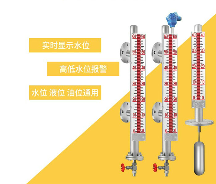 磁翻闆液位計測量液體時采用頂裝或旁通管側裝方式。磁翻柱主體外加裝翻柱液位指示器、液位開關及液位變送器。磁單元置于浮球内部或通過頂杆與浮球相連,當浮球連帶磁單 元随液位變化時,使磁性色塊(磁翻闆)翻轉;磁性液位開關在對應液位點動作;同時液位傳感器在浮球磁力的作用下,輸出标準的變化電阻信号,再經過變送器把電阻信号轉換 成4~20mA電流信号輸出。